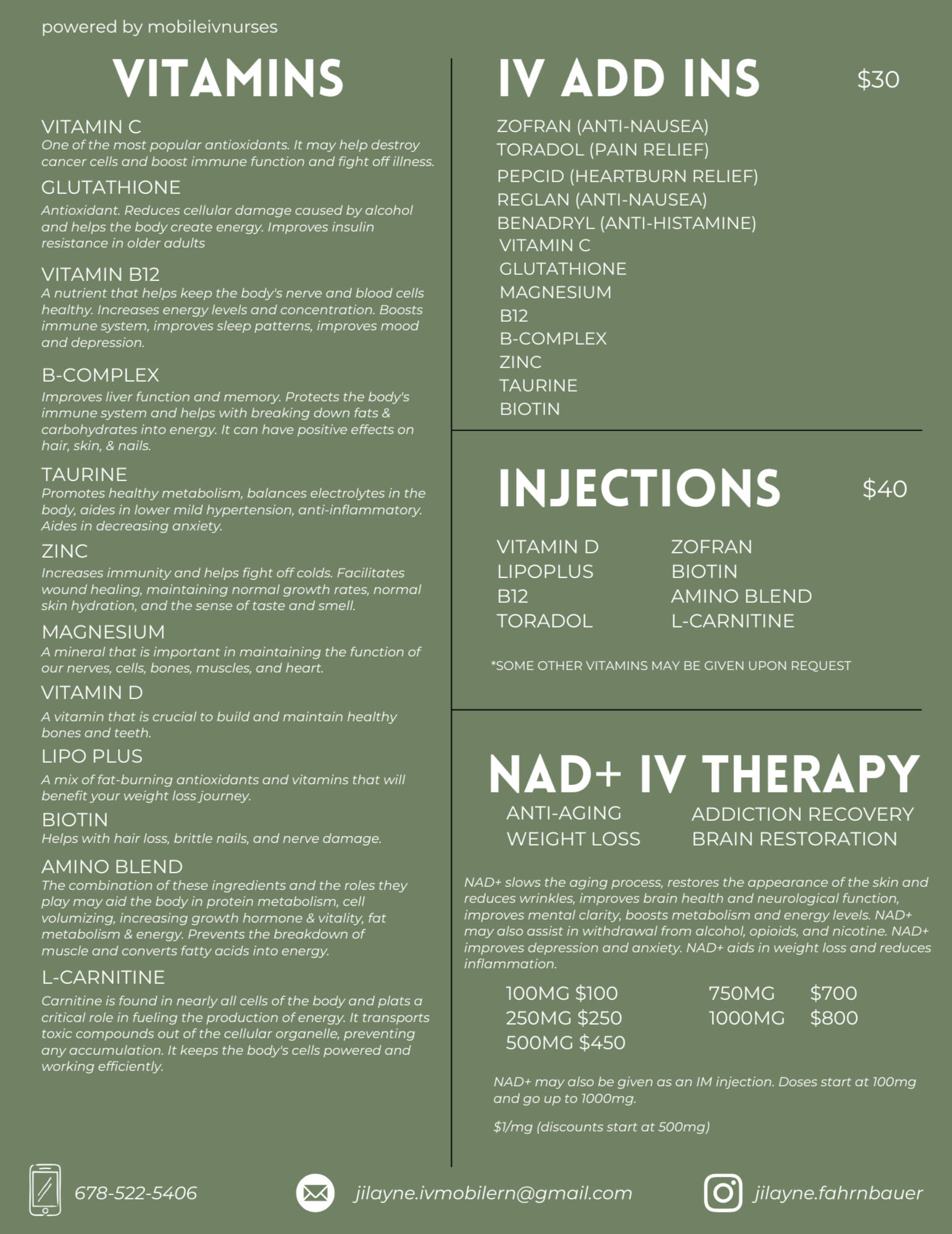 During my 5+ years as labor and delivery nurse, I have learned how rewarding it is to care for people and make a real difference in how they feel. That same passion for helping others is what led me to IV hydration and wellness therapy.Through personalized IV infusions in the ATL area, I help clients boost their energy, recover faster, and support their overall health. Whether you’re recharging after a long week, prepping for a big event, or just investing in your wellness, my goal is to make feeling your best as easy and accessible as possible.So book a treatment with me & let’s get you feeling refreshed & recharged!